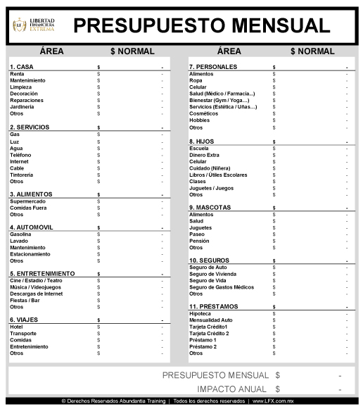 Con este formato podrás tener reflejados todos tus gastos mensuales, al final harás la suma de todos los gastos y a este número lo conoceremos como «número de Libertad Financiera» que es la cantidad de dinero que necesitas cada mes para mantener tu estilo de vida.